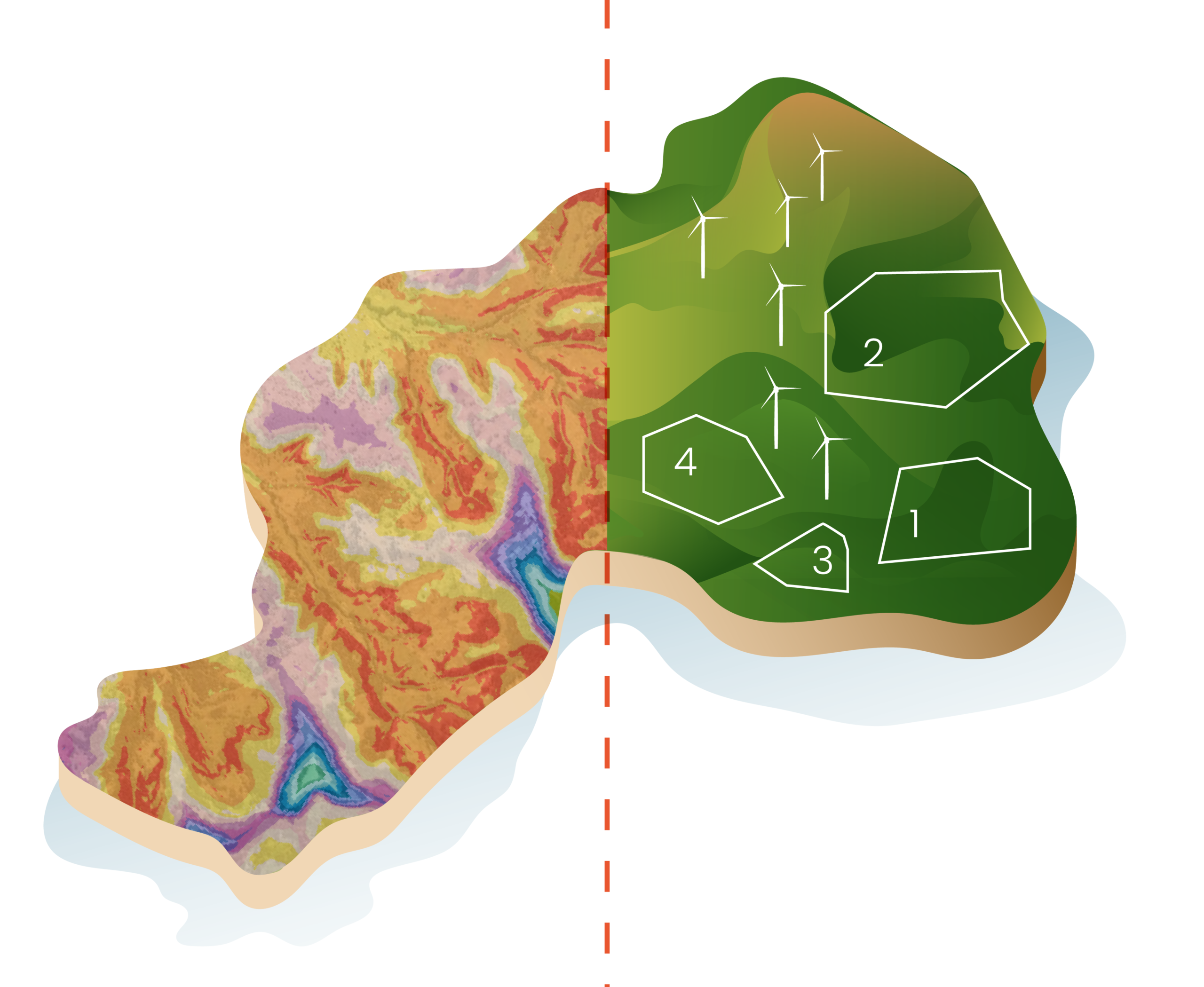 Our analyses provide us with a recipe for our secret sauce, which can be tailored to a specific market to understand what makes for a perfect wind farm. From there we algorithmically search our area of interest for sites matching those same criteria.